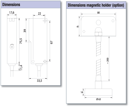 The hydrotechnik's rotational speed sensor RS 110 uses pulsating red light (LED) refl ected by a special tag at the rotating target. By using a polarisation fi lter, only the refl ected light impulses are evaluated, disturbing refl ections (e.g. unevenness of the surface, bright metal parts, keyways or high-contrast areas) are not detected. This achieves a reliable rotational speed measurement from distances between 50 mm and 4 m*.25 refl ection tags are included. Enter the number of used reflection tags as calibration value into the measuring instrument.